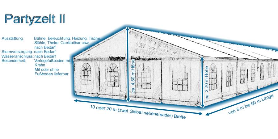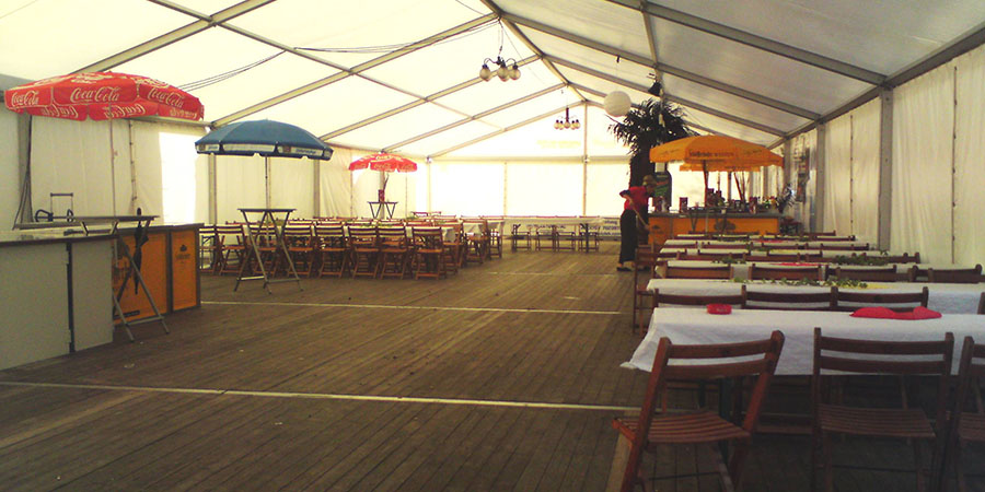 Wir können Ihnen Zelte in den Größen von 250 bis 1120m² für Ihre Veranstaltung bereitstellen. Unsere Festzelte werden grundsätzlich mit Schwerlastfußboden verlegt und sind für Veranstaltungen jeglicher Art bestens geeignet.